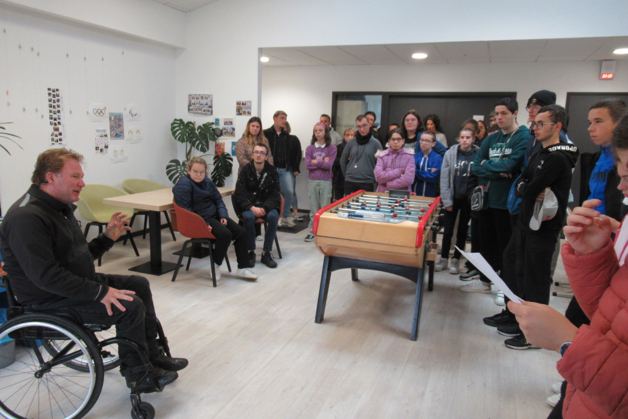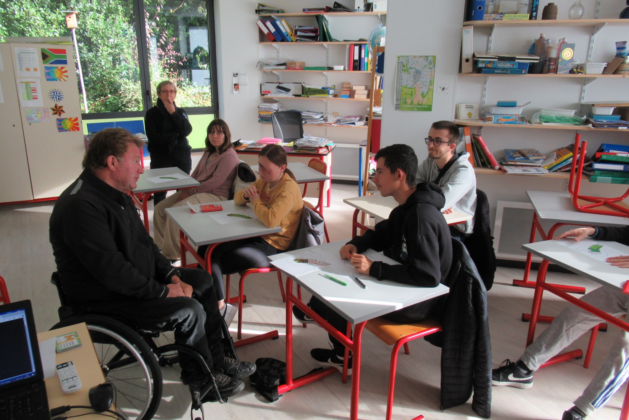 Dans un 1er temps, les jeunes ont pu poser les questions qu’ils avaient préparées avec les enseignants. Leurs interrogations portaient beaucoup autour du fauteuil de Yann et de ses habitudes de vie : « Comment faites-vous pour faire à manger, pour faire les courses, pour conduire ? Comment allez-vous pouvoir aller dans les classes ? » Des questions plus personnelles ont été posées auxquelles Yann a répondu avec simplicité : « Comment as-tu eu ton accident ? Si je te donne un coup de pied, est-ce que cela te fait mal ? Quel est ton métier ? »