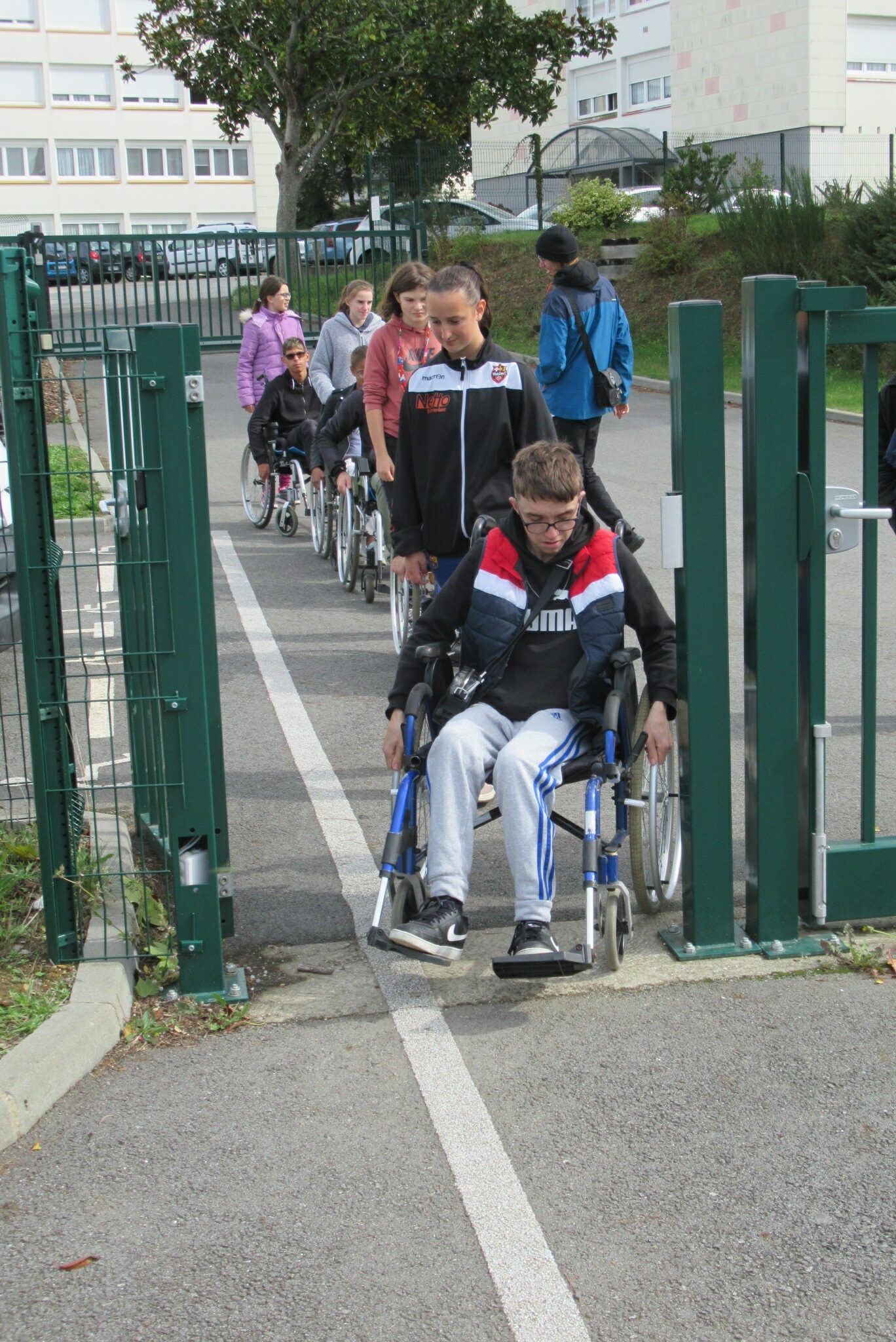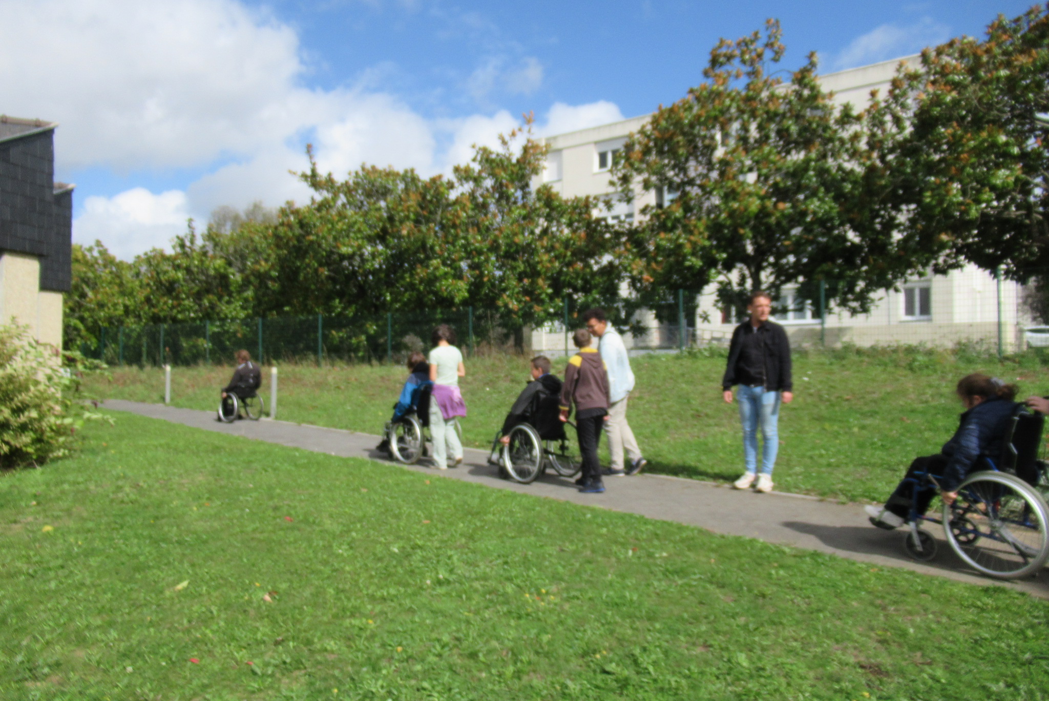 L’après-midi a été le moment idéal pour partager un temps plus sportif. Chaque jeune a pu essayer de se déplacer en fauteuil roulant sur un parcours au sein de l’IME. Le maniement du fauteuil, le passage des portillons ou des pentes se sont avérés être des petits défis. « Yann doit être fatigué à la fin de la journée ! » s’inquiéte Jade. Chacun a pu tester l’accélérateur adapté au volant de la voiture.